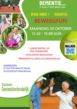 * Op maandag 20 oktober van 13.30 15.00 uur organiseren we deze BeweegFUN. Een uur beweeg- en spelplezier op de tennisbaan met aansluitend koffietime & gezelschapsspel (voor wie dat wil).
